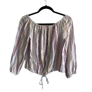 Super cute and soft pastel striped off-the-shoulder long sleeve top from the Gap Drawstring at hem, elastic at shoulder line and wrists 55 linen, 45% rayon
