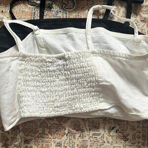 Selling these as a bundle! Made in Indonesia. These Linen/Cotton blend tops have removable straps and an elasticized back for comfort. I have worn/washed the white and black and you can see there has been some shrinking. The Navy one is new and never worn. I'm going for more flowy tops these days, which is why I'm selling. A great bundle deal!