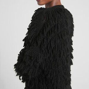 ❥ Details: Soft, textured wool-blend knit, Long sleeves, ribbed-knit cuffs, Knit trim at open-front, Ribbed-knit hem, Allover loop knit fringe.