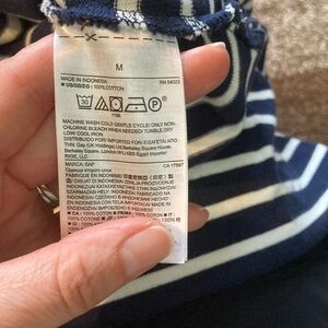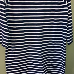 This stylish mini maternity dress from GAP showcases a classic blue and white stripe pattern, ideal for casual or work settings. Featuring a chic bateau neckline and 3/4 raglan sleeves, it offers both comfort and elegance. The sailor collar adds a distinctive flair to this versatile piece. The material is very thick and not very stretchy.