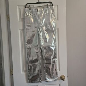 Shiny silver straight leg pants. Sleek and stylish design. Perfect for a bold look.