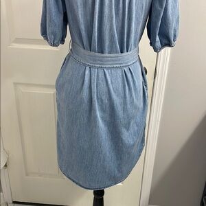 This stylish blue denim dress from GAP features a buttoned front, side pockets and a tie waist, perfect for casual and work settings. The short puff sleeves and mock neck add a touch of elegance, while the relaxed fit lightweight fabric ensures comfort throughout the day.