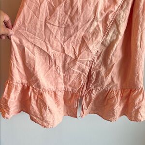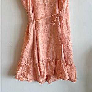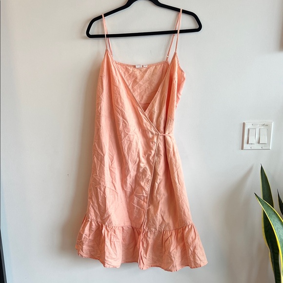 Elegant mini dress with a wrap design. Features a ruffle hem and thin straps.