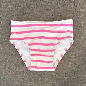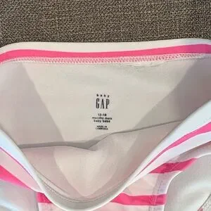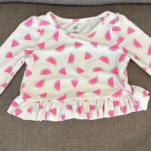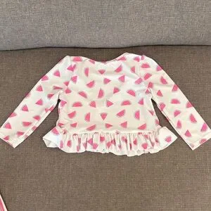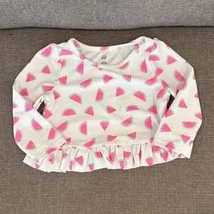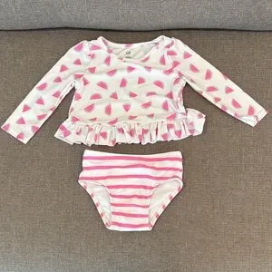Two-piece swim set from GAP. Long-sleeve rashguard with watermelon print and ruffle hem. Matching striped bikini bottoms. Soft, quick-dry fabric with UPF protection. Cute and playful pool-ready look.