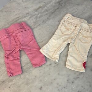 This delightful set from GAP includes a pair of solid pink jeans and a cream pair adorned with colorful floral embroidery. The pink jeans offer a simple, comfortable design, while the cream jeans add a touch of elegance with their decorative accents. Perfect for casual outings or special occasions, these jeans combine style and comfort effortlessly.
