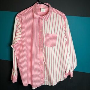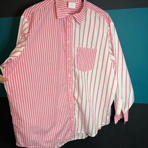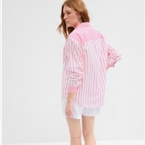 This GAP top features a chic oversized design with a classic dress shirt collar, perfect for a relaxed yet stylish look. The pink and white stripes add a touch of fun to a classic shirt! Ideal for both casual outings and semi-formal occasions, this shirt combines comfort with a fashionable edge.