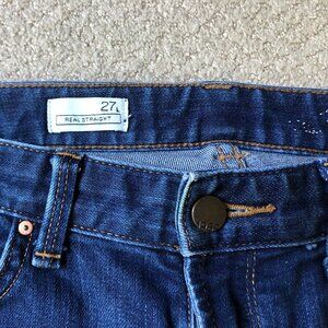 Stretch mid-rise jeans in dark blue denim. Good condition with some fading from multiple washes.