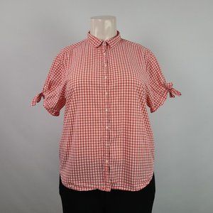 Stylish checkered button-down shirt. Features short sleeves with tie details. Classic collar design. Perfect for casual wear.