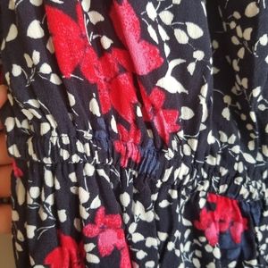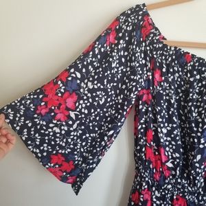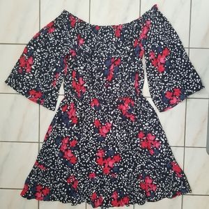 GAP Ruffle A-Line Dress, size Small in a navy background floral print. The bohemian inspired dress is made with a lightweight 100% rayon fabric with an elastic waist and a elasticized neckline which make the sleeves as an optional off the shoulder look.