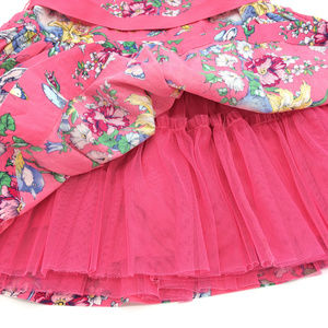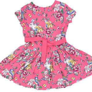 Bubble gum pink dress with fairytale woodland images including flowers, rabbits, birds and butterflies.