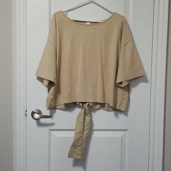 Boat neck, half sleeves, waist tie at the back. Loose fit. Never worn.