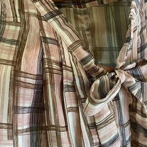 This beautiful plaid like print blouse features Vneck, pleats below, tie in front, darted back, down collar, light silk like fabric. Can tie for cropped look.