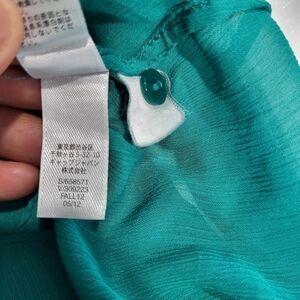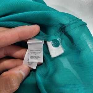 Sheer and comfortable fabric. Button down with collared, ruching detail on shoulder and back give a flowy, airy free. High-low.