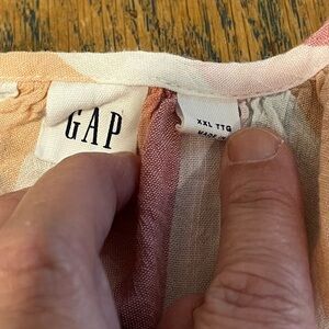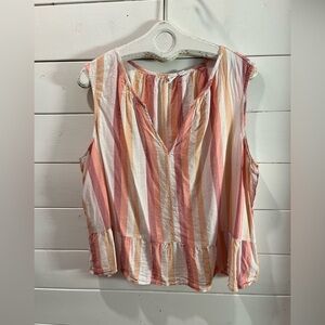 Fresh and summery, this GAP sleeveless blouse features vertical stripes in warm tones of peach, coral, pink, and ivory. Designed with a flattering V-neckline and a ruffled hem, it brings a relaxed yet feminine vibe. Perfect for pairing with jeans, shorts, or skirts for a chic casual look.