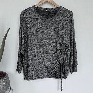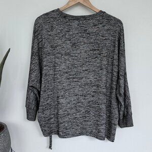 Super soft and comfy, and elevated with cute cinching. Dolman Sleeve. Supersoft marled knit. Slightly cropped dolman sleeves. Ribbed trim at banded cuffs. Ribbed trim at round neckline. Drawcord cinch and tie at wearer's left side.