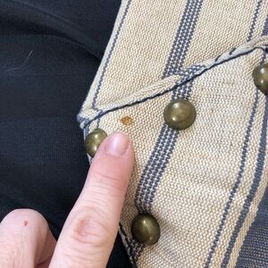 Cute beach bag or everyday tote! Beige and navy stripes with brown fabric handles. Bag is jute and cotton with polyvinyl. From summer 2007.