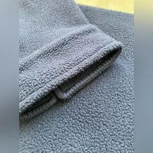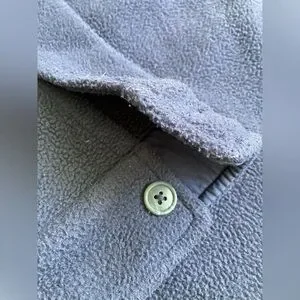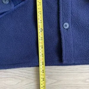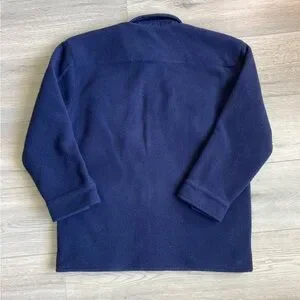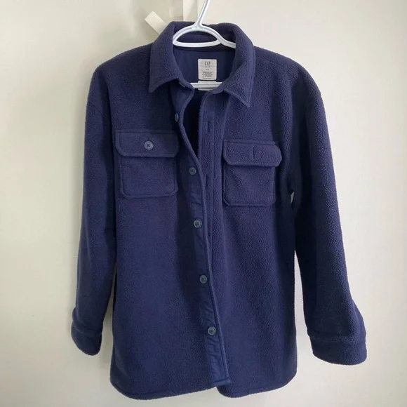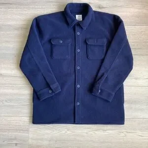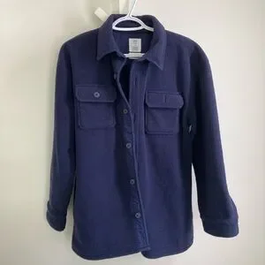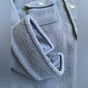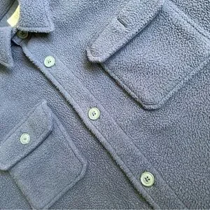 Cozy navy fleece-like shacket with button-up front and chest pockets plus two side pockets.