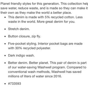 • This denim is made with 5% recycled cotton. Less waste in the world. More great denim for you.