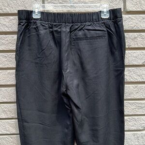 Gap Tencel pants. Zipper fly with button and hook closure but also has an elastic waist all the way along the back for a flexible fit. Elastic waist is very stretchy, see video. High waist and ankle length with 2 side slip pockets and 1 back pocket (still sewn closed). Tapered legs with small v at cuff.