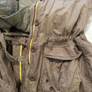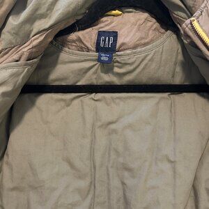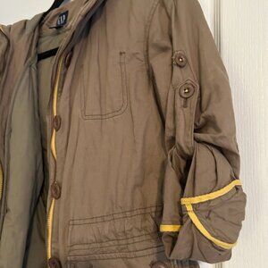 A vintage piece from GAP, blends rugged utility with playful design details. Removable lining makes this a great transition to fall must have piece, drawstring on the inside provides for a customizable fit, and hood with hidden wire piping for structure. Roll up the buttoned sleeves, zip or button the front, flap pockets and top-stitched seams.