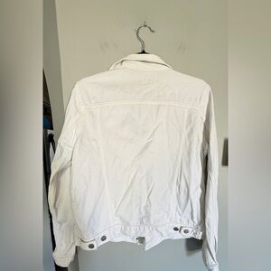This white jean jacket from GAP offers a fitted silhouette with a cropped length, making it a versatile addition to your wardrobe. Its crisp white color and classic design make it perfect for layering during the warmer months.