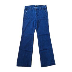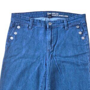 Gap mid rise wide leg with buttons on pockets. Size 8. Really cute with a chunky heel and tight shirt. Very comfy as it’s mid rise and has a slight stretch to the material.