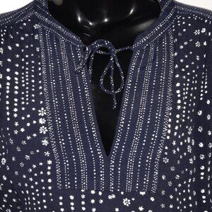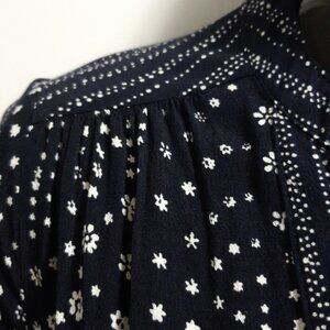 I love this dress! It is navy with a white flower pattern that is trimmed at the neck shoulders and hem in a dot pattern. It has a working tie waist and elastic cops at the wrist. There is also a tie at the neckline to make it more of a keyhole. It is an extremely flattering dress.