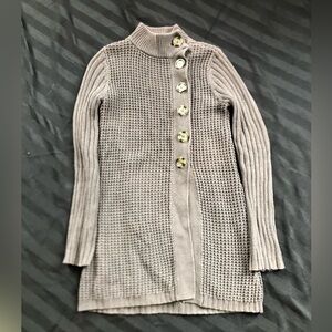 Stay cozy and stylish with this chunky knit gray button-up sweater. Perfect for layering and adding a touch of sophistication to any outfit. Off centred buttons add a bit of a mix up to your average cardigan. Very warm and comfy- nice sleeve length, can be made shorter by turning the sleeve cuff up.