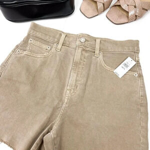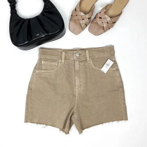 Brand new with tags, these GAP high-rise denim shorts are made with Washwell, a sustainable denim process. In a vintage-inspired khaki brown wash, these shorts feature a low-stretch feel that forms perfectly to your shape after wear. The distressed hem adds a trendy touch, and they’re snug at first, offering that vintage denim vibe with just a bit of stretch.