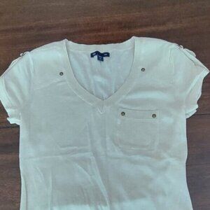 GAP Women's Knit Short Sleeve Sweater Size XS Light V-neck Ladies Sweater With Detailed Pocket Studs and Shoulder Strap Off White 100% Cotton Excellent Condition