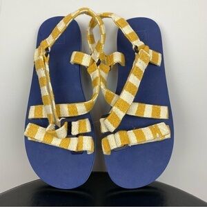 Strappy canvas strap sandals in yellow and cream stripe print. Adjustable Velcro straps around ankle and over toes for custom fit.