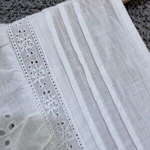 This top has really beautiful construction! Breathable, airy slub cotton weave. Eyelet embroidered flutter cap sleeves. Pintuck detailing at V-neck and V-back. Shirring at front and back yoke seam adds fullness throughout. Delicate lace trim at neckline.