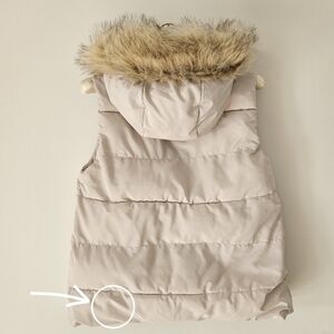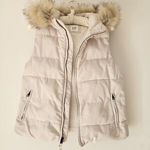 This off-white very light cream coloured GAP faux fur lined hooded puffer vest will keep you warm on chill days! Wear it as the sole outer layer on spring and fall days or layer under a winter jacket for extra warm when it's freezing.