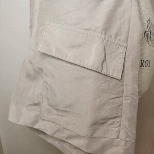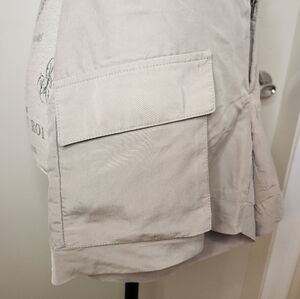 Tan khaki low waist cargo shorts with front flap pockets and back slit pockets (still stitched shut), by GAP.