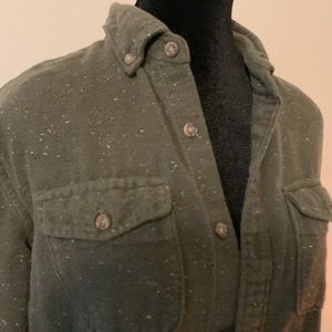 Cotton/acrylic/polyester button down shirt in a really nice forest green colour with little white tweed-like speckles. Perfect for the colder seasons!