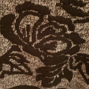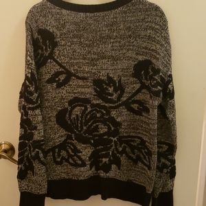 Gray and Black sweater with a Black bold flower print throughout with Black solid bands at the bottom and sleeves slight side slit detail.
