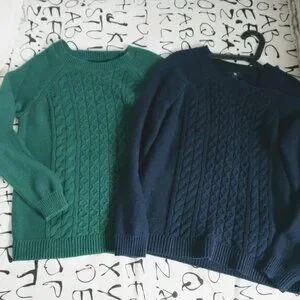Cable knit sweaters, cotton, one navy, one green. Also listed separately. $25 for both.