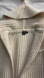 Elegant cream cardigan with a cozy hood. Features ribbed texture and long sleeves. Ideal for layering. 50% wool. Length from shoulder 38”