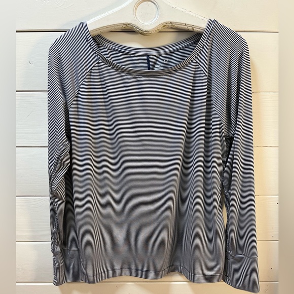 Lightweight and breathable striped long sleeve top by GAPFIT. Features a classic navy and white micro-stripe pattern, a relaxed silhouette, and soft performance fabric designed for comfort and movement. Perfect for workouts, layering, or casual wear.