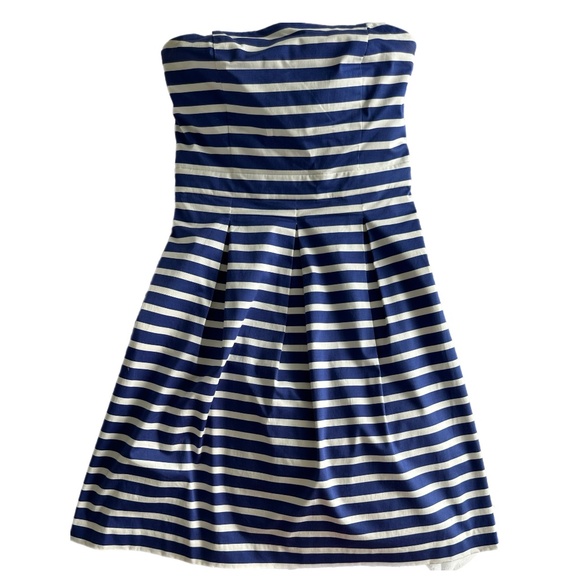 Knee length cotton strapless dress; pleats; back zip; lined top; side pockets