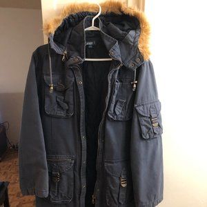 3/4 Length, Dark Blue Winter Coat With 5 Pockets Plus Brass Buckles