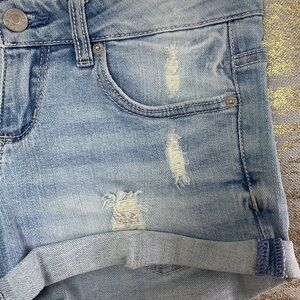 - Beautiful light blue wash distressed flirty denim stretchy shorts.rolled cuffs with 5 pockets style with belt loops and zipper closure.perfect for summer time