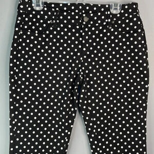 Ladies black with white polka dot print Garnet Hill mid rise jeans with zippered ankles.