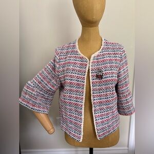 Preppy chic inspiration for this short jacket in multicolored textured fabric. The design features a crew neck, a flared fit, a cropped length, and three-quarter-length bell sleeves with a ruffle. The edges are trimmed with braid and the jeweled patch is applied to the chest.