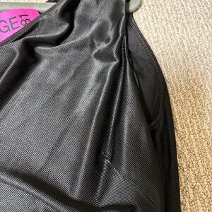 Showcasing a handmade snake chain shoulder strap, this dress is totally off the chain. Jet black. Sheen satin fabric. Asymmetric neckline. Gold tone shoulder ...