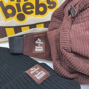 Brand new with tags Limited Edition Tim Horton’s x Justin Bieber swag, includes all three pieces, the beanie toque, the retro vibe brown corduroy fanny pack and the cool heavy canvas tote bag.