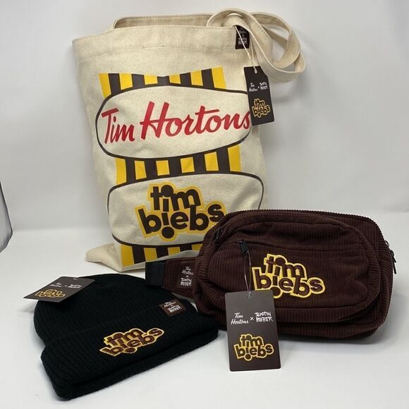 Brand new with tags Limited Edition Tim Horton’s x Justin Bieber swag, includes all three pieces, the beanie toque, the retro vibe brown corduroy fanny pack and the cool heavy canvas tote bag.