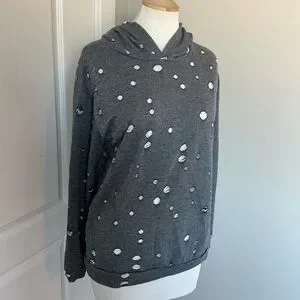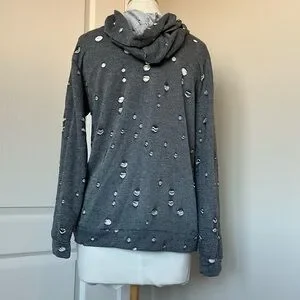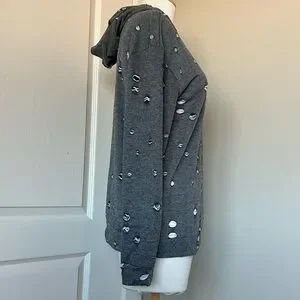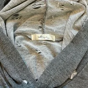 A unique knight knitted hoodie will distressed roiled holes through out. It’s cute with jeans as well a cute “coverup” over a pair of shorts and a white tank for the summer.