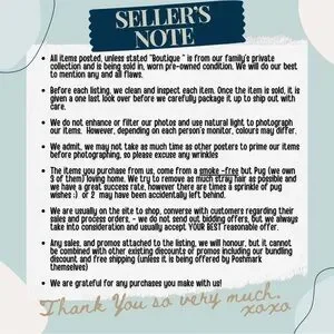 All items are posted from our family’s private collection and have all been loved and worn gently. We are a pet friendly, non-smoking home and take good care of our possessions until it leaves our house. Your item will be shipped to you with care.