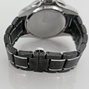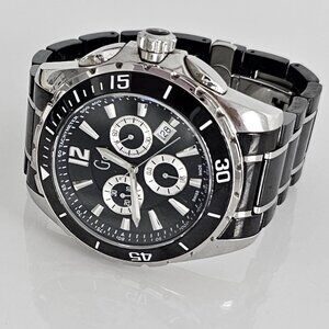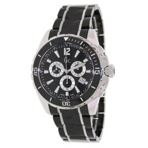 The X76002G2S is a chronograph men's watch with a case diameter of 45 millimetres. The GC watch has a black ceramic strap and a black dial with silver-tone accents.